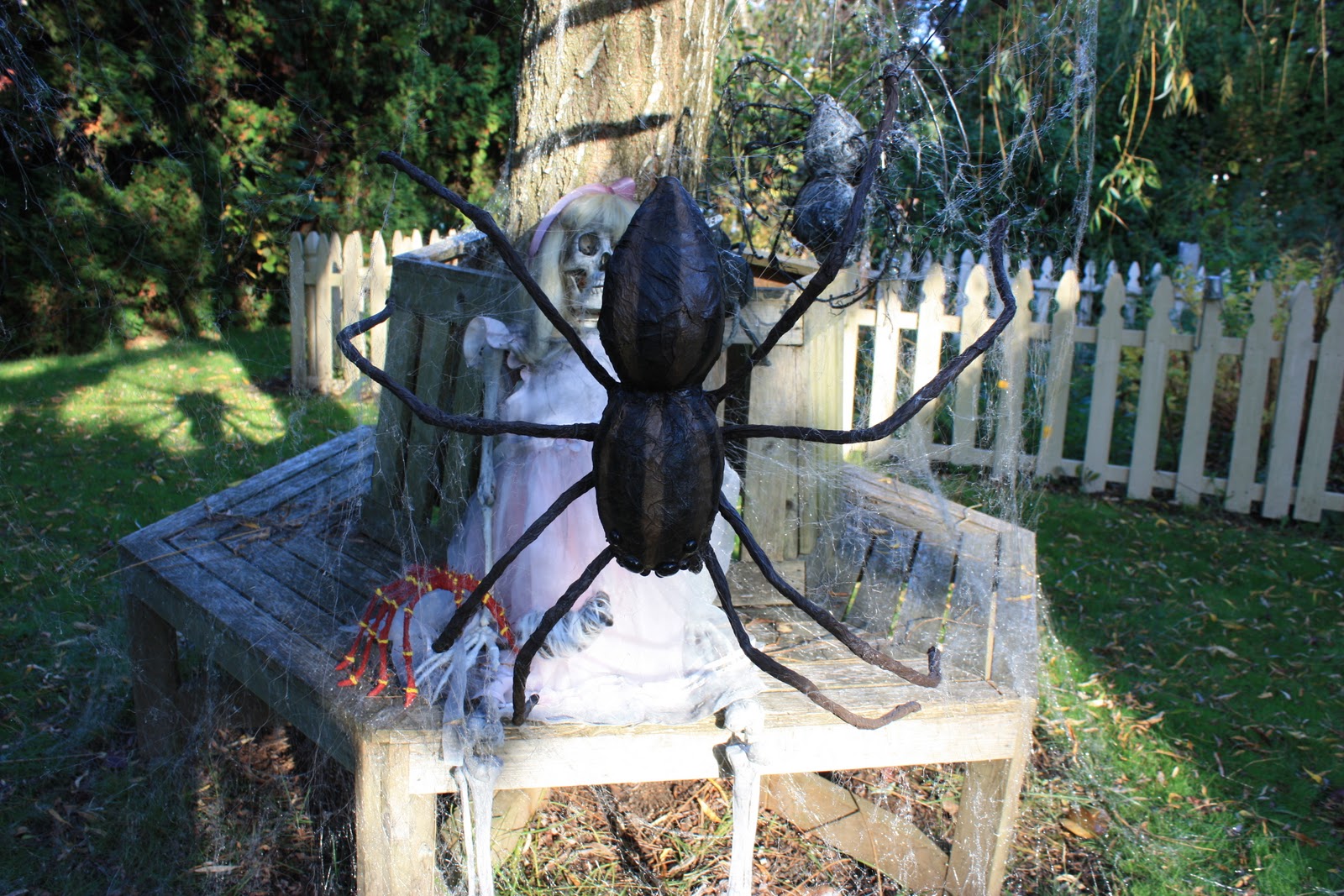 Chris asked her blog friends to send her spiders she could hang in the tree and create a little miss muffet scene she could photograph Halloween day. Here are some photos of her setting up. We also took some pictures of our graveyard dancers with the spiders.